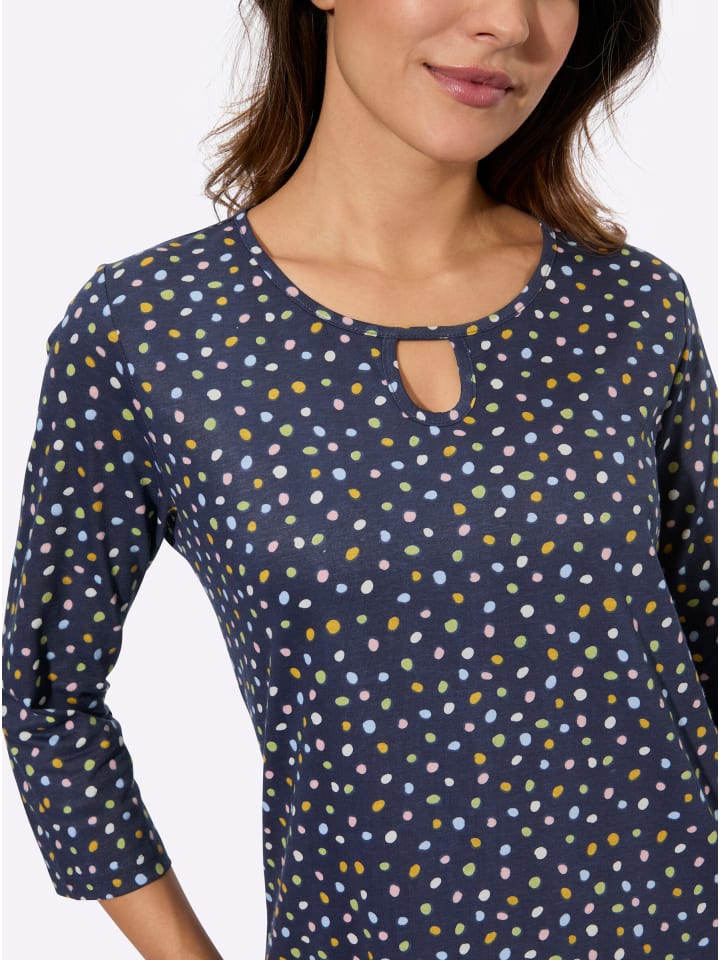 Наслаждайтесь отдыхом в этой стильной повседневной рубашке! Круглый вырез с окантовкой и каплевидным вырезом снизу. Популярные рукава 3/4. Боковые разрезы обеспечивают оптимальную свободу движений.