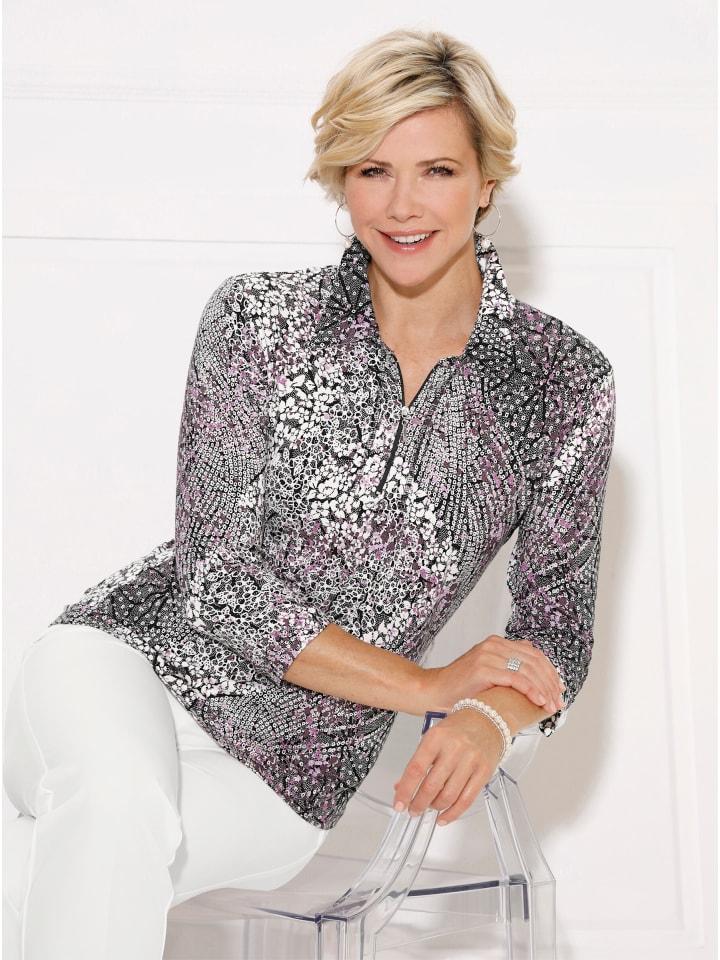 С привлекательным принтом по всей длине! Рубашка с воротником-поло и сверкающими стразами на молнии. Рукава 3/4 с разрезом. Прямой подол.