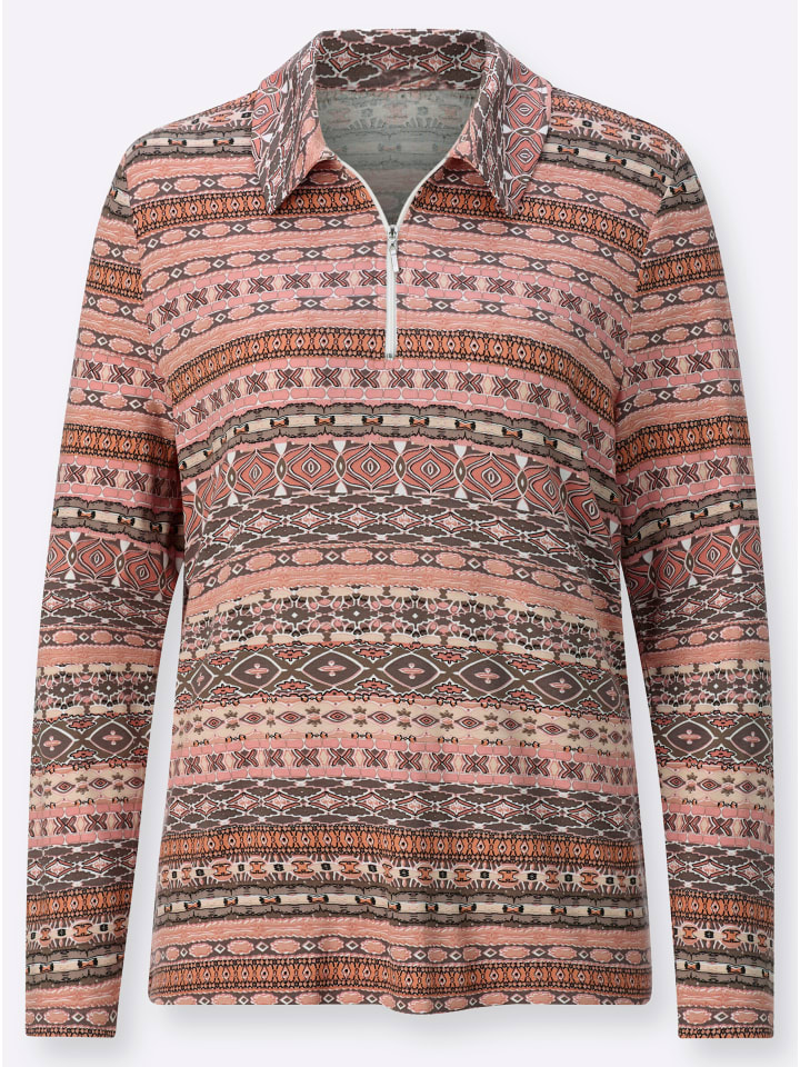 Спортивный, повседневный, удобный: рубашка с принтом, воротником-поло, короткой молнией и длинными рукавами.