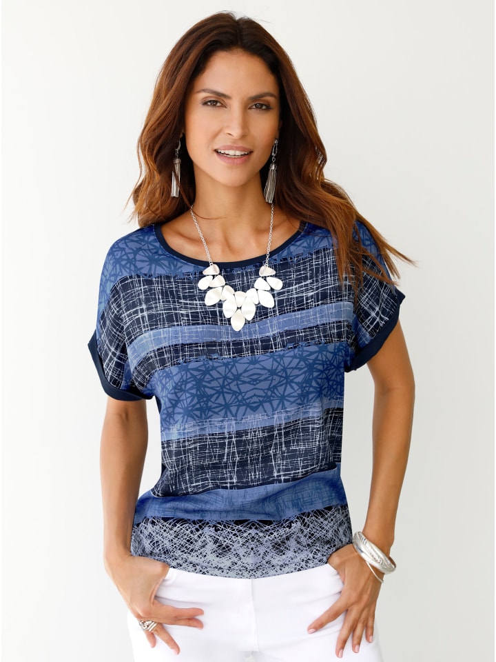 Эта рубашка - настоящий хит! Передняя часть выполнена из элегантного струящегося матового атласа с разноцветным принтованным полосатым узором, а спинка - из мягкого трикотажа. Модное спущенное плечо с контрастным фиксированным отворотом.