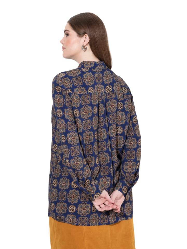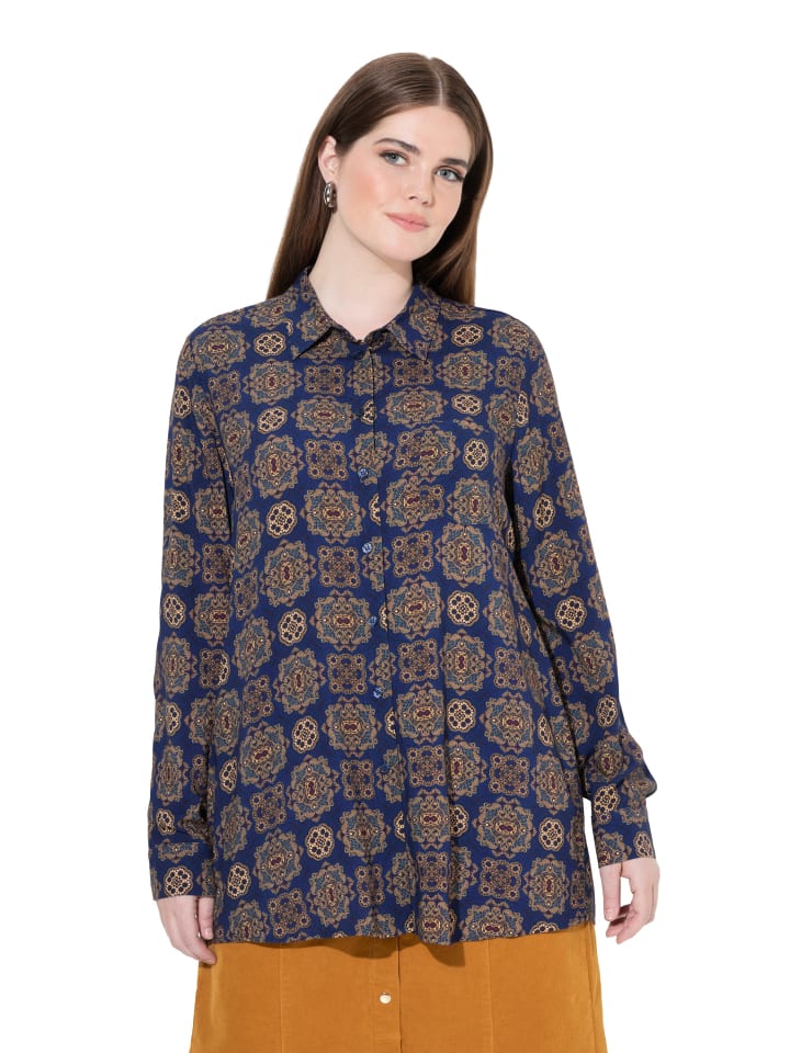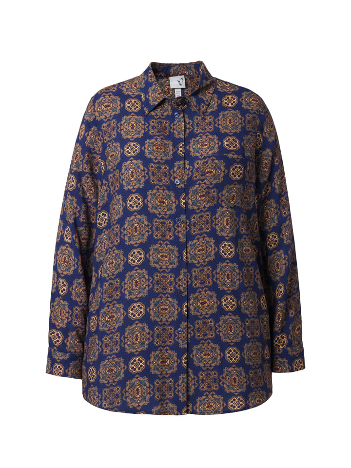 Блузка-рубашка, прямого кроя, из мягкой вискозы с орнаментом. Отложной воротник, планка на пуговицах, нагрудный карман. Длинные рукава с манжетами.