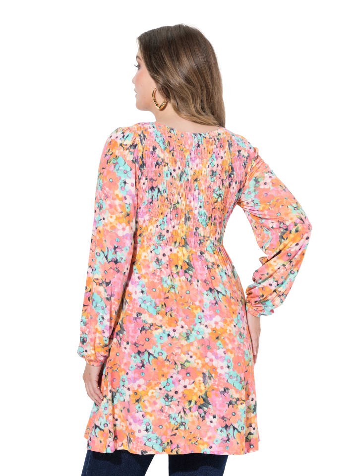 Футболка А-силуэта с присборенным бюстом на резинке. Изготовлена из мягкого трикотажа с цветочным принтом. Круглый вырез, широкие рукава 3/4 с манжетами на резинке. Комфортная ширина подола.
