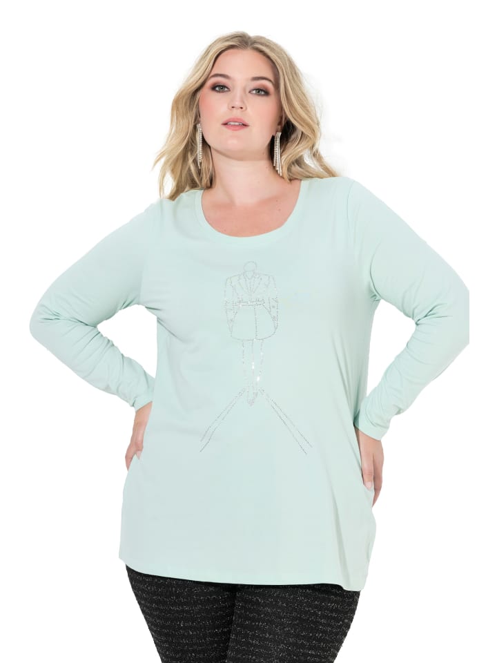 Футболка А-силуэта с рисунком модели, выполненным из стразов. Круглый вырез горловины, длинные рукава.