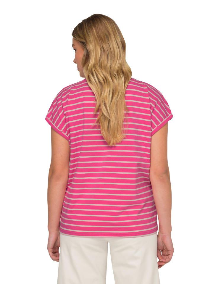 Футболка свободного кроя с полосками и надписью по подолу. Круглый вырез горловины, спущенная линия плеча, короткие рукава.