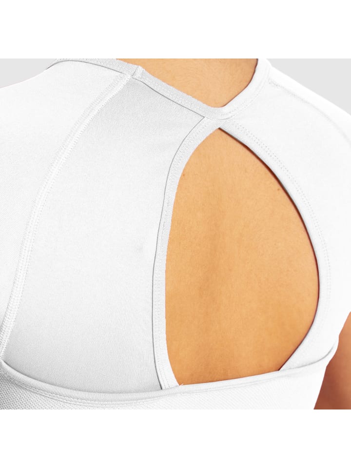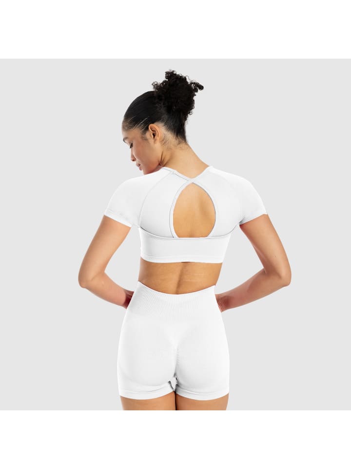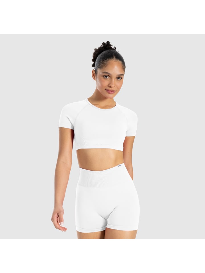 Этот бесшовный укороченный топ сочетает в себе функциональность и лаконичный, женственный вид. Облегающий крой с короткими рукавами создает четкий силуэт, а бесшовная конструкция обеспечивает комфорт. Широкая эластичная лента под грудью обеспечивает надежную поддержку и подчеркивает форму. Изящная текстура на спине и груди добавляет визуальный интерес и делает топ универсальным предметом одежды, идеально подходящим для ношения с леггинсами с высокой талией или шортами.