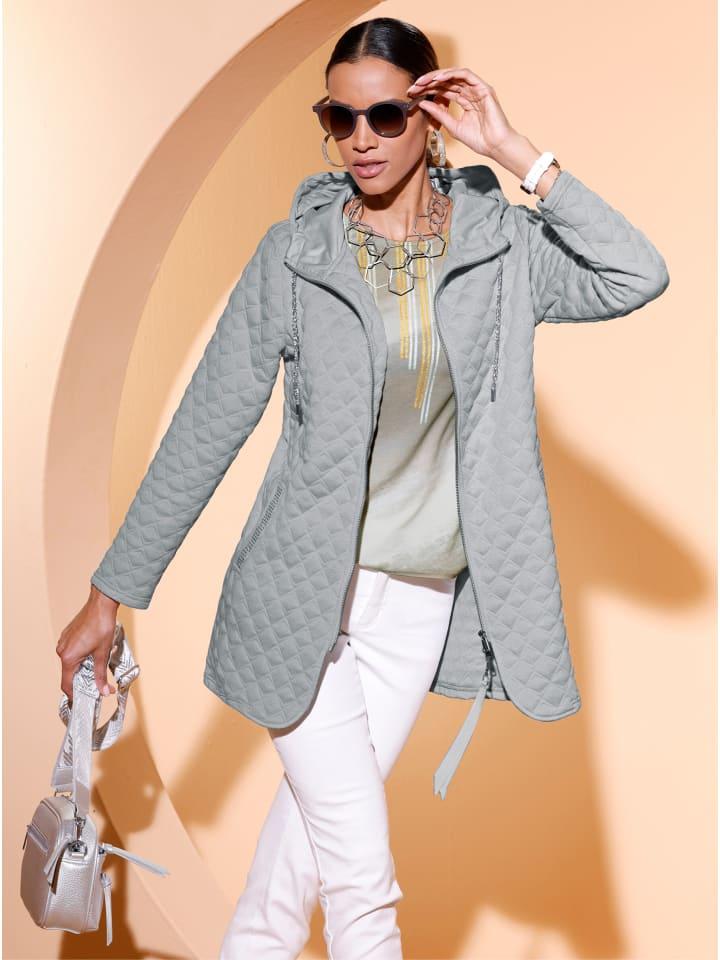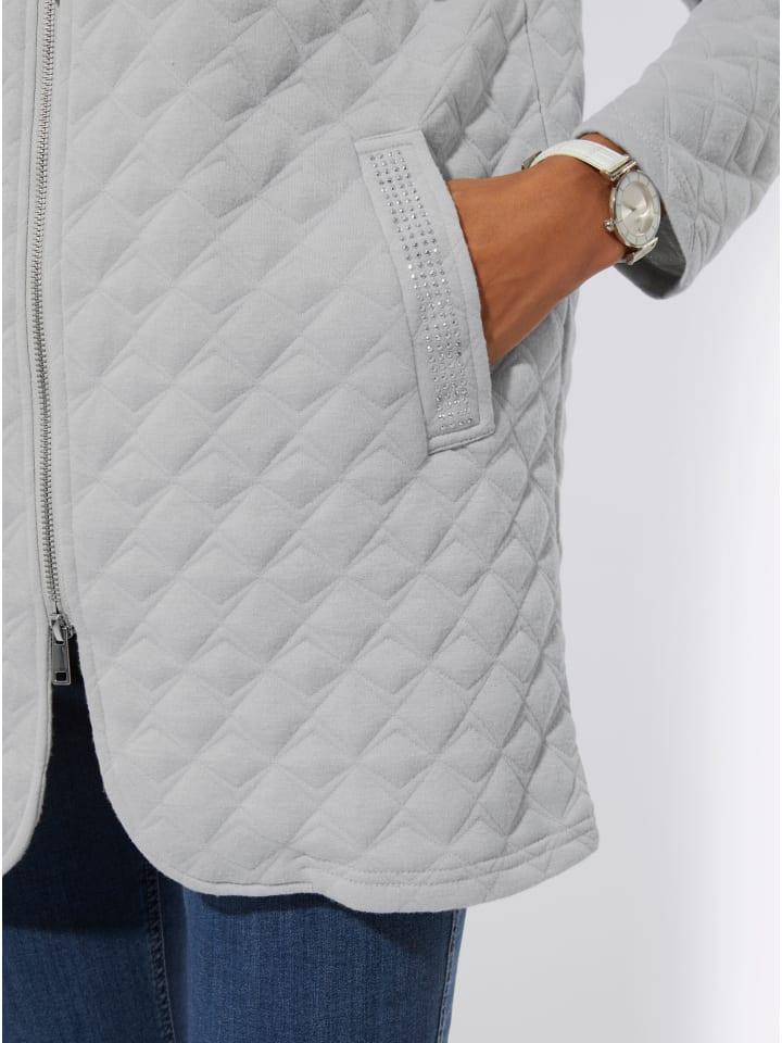 Вниманию модниц! Представляем вам эту повседневную и современную толстовку с ромбовидным узором. Регулируемый капюшон и двусторонняя молния. Прорезные карманы украшены серебристыми стразами. Длинные рукава.
