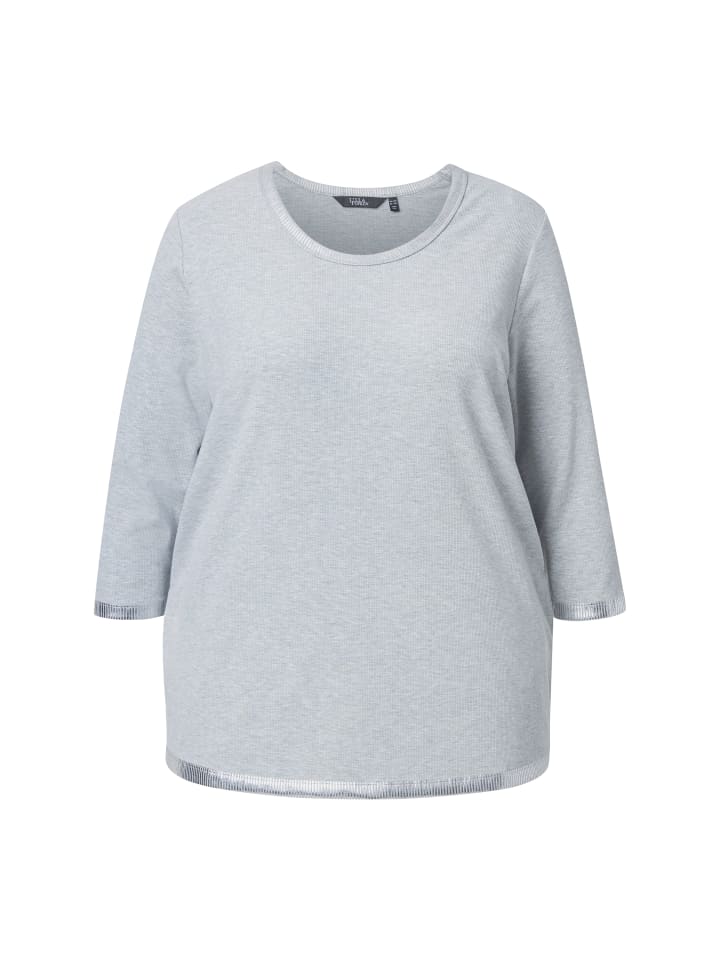 Футболка классического кроя из приятного к телу меланжевого трикотажа с блестящим серебристым принтом по краям. Круглый вырез, рукава 3/4.