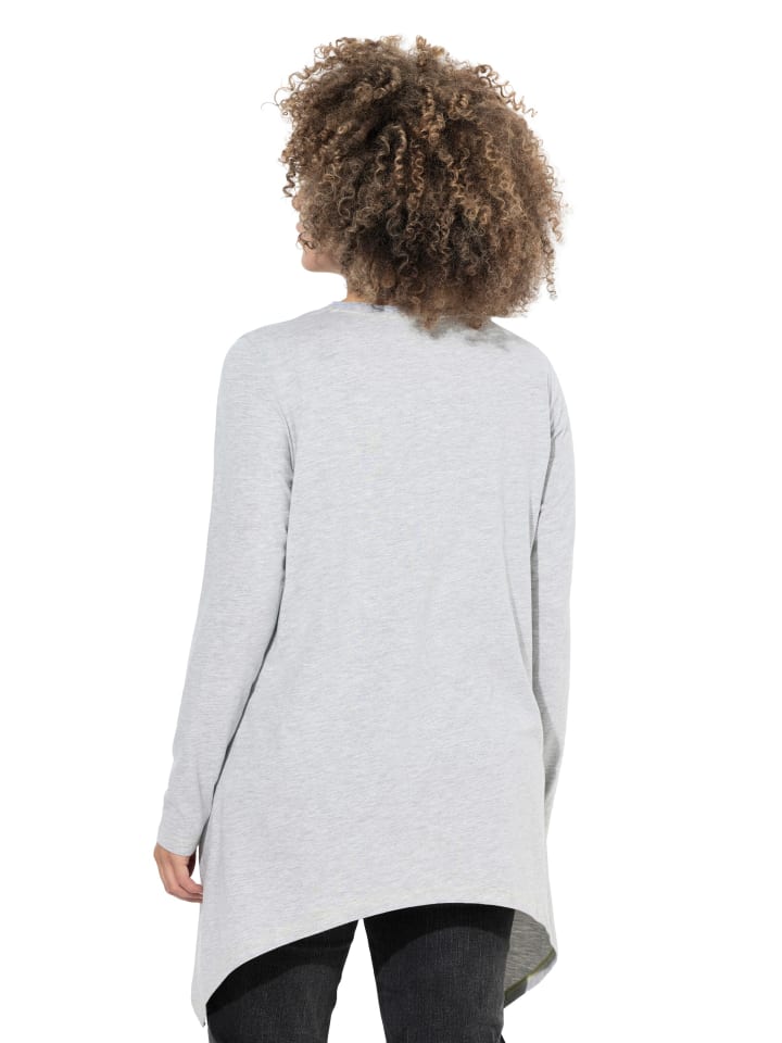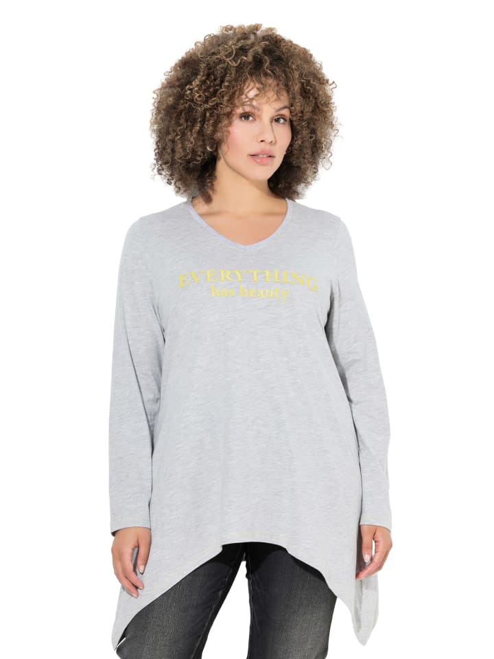 Футболка А-силуэта из мягкого трикотажа с надписью и острым краем. Округлый V-образный вырез, длинные рукава.