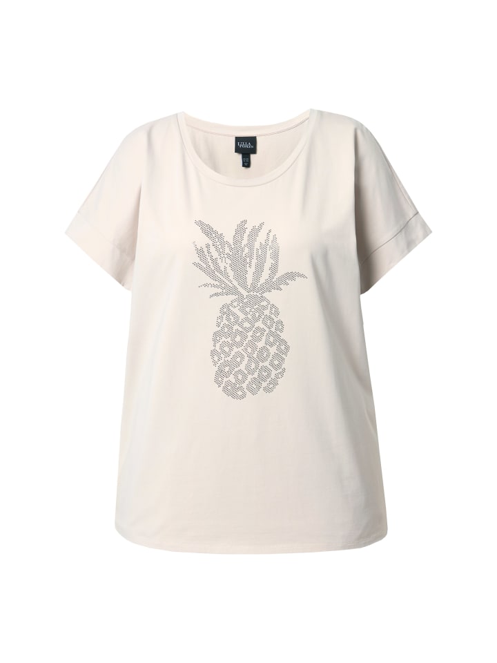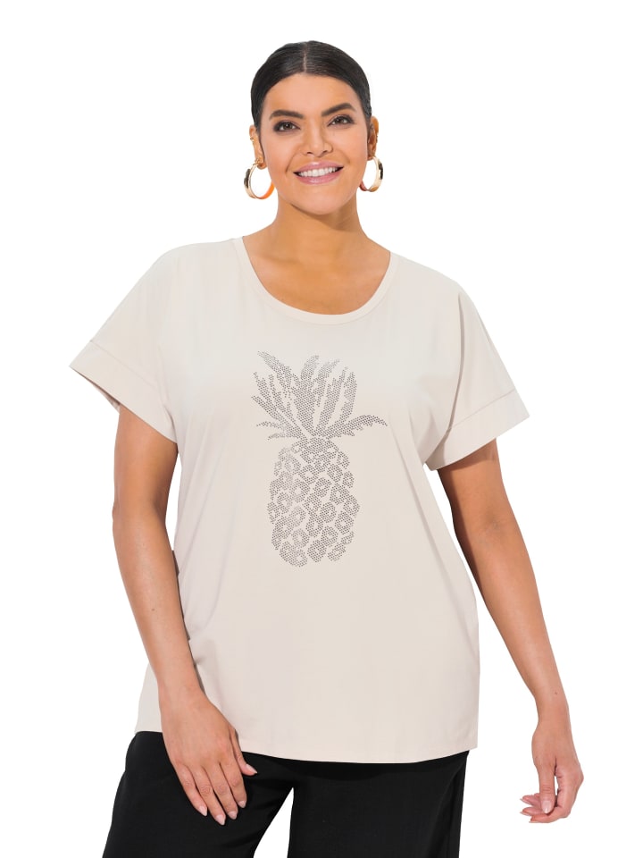 Футболка свободного кроя из мягкого трикотажа с рисунком ананаса, украшенным стразами. Круглый вырез горловины, спущенная линия плеча, короткие рукава с отворотами.