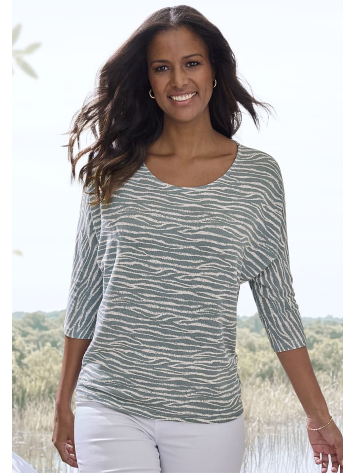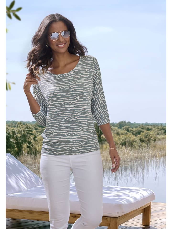 Для отдыха: рубашка с рукавами 3/4 от Lascana, круглым вырезом и анималистичным принтом. Свободный крой со спущенной линией плеча. Шов сзади. Мягкая, струящаяся вискозная ткань.