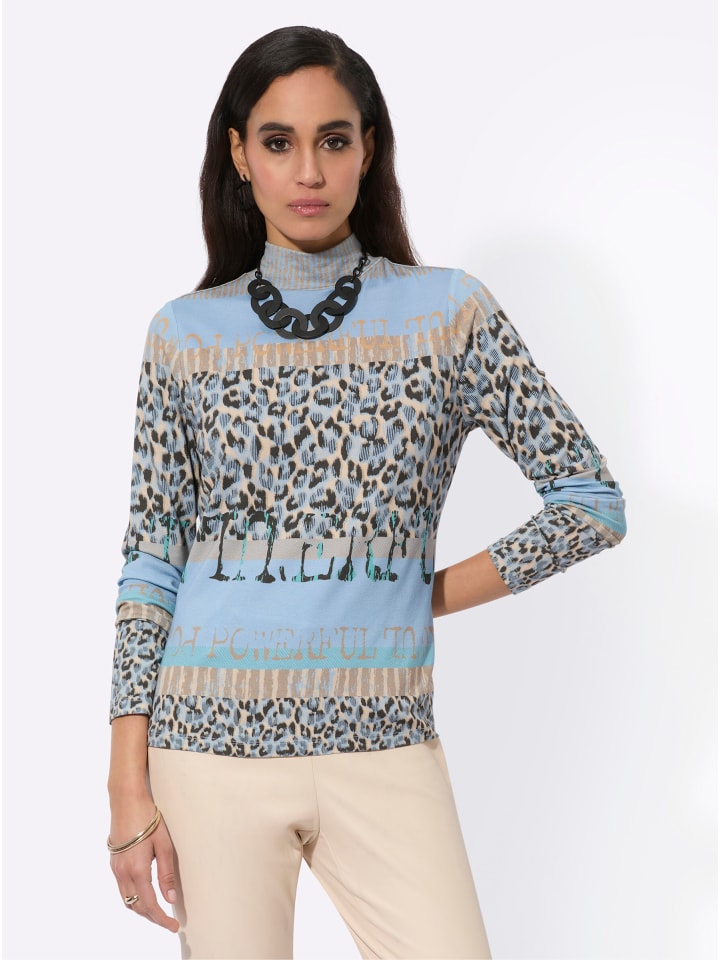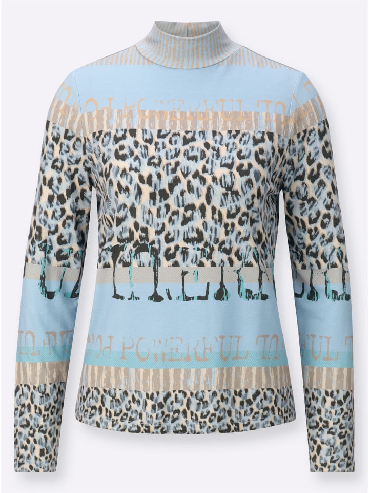 Эта привлекательная рубашка с воротником-стойкой впечатляет сочетанием дизайна с акцентами на леопардовом принте.