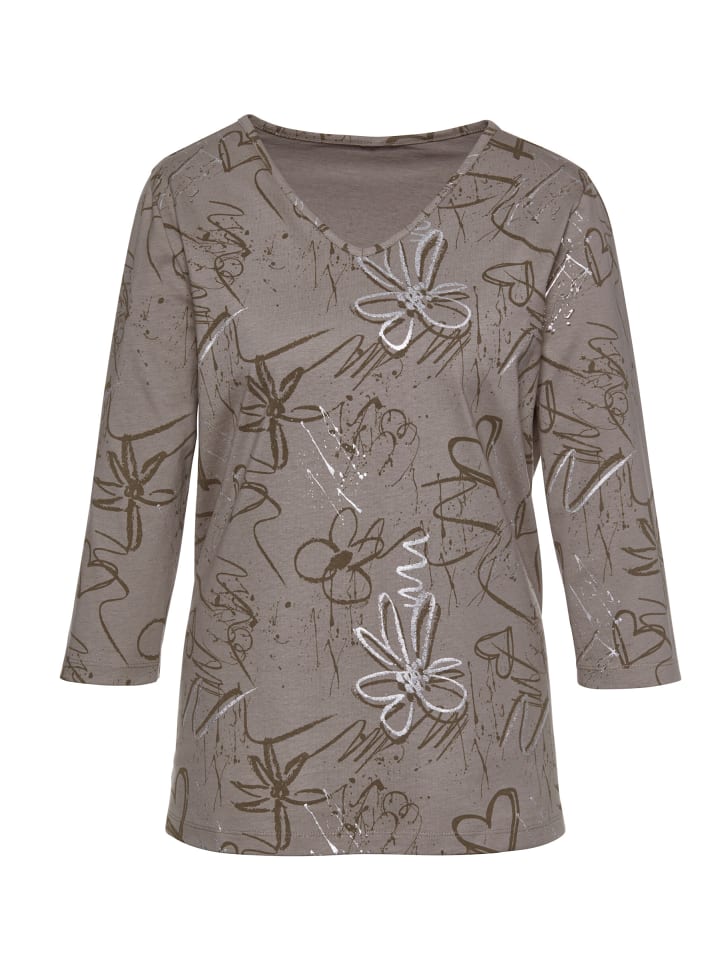 Яркие перспективы на каждый день: рубашка с принтом в виде сердец и цветов по всей длине, украшенная серебристой фольгой. V-образный вырез и рукава ¾.