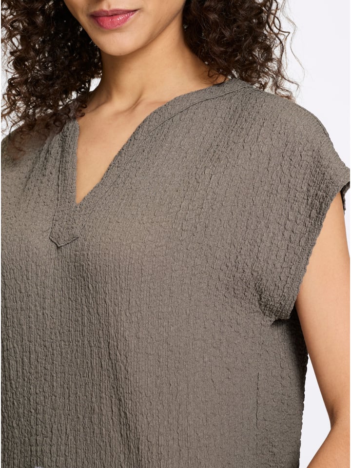 Рубашка из ткани с эффектной текстурой. Круглый вырез горловины с открытым V-образным вырезом, спущенные плечи, короткие рукава.