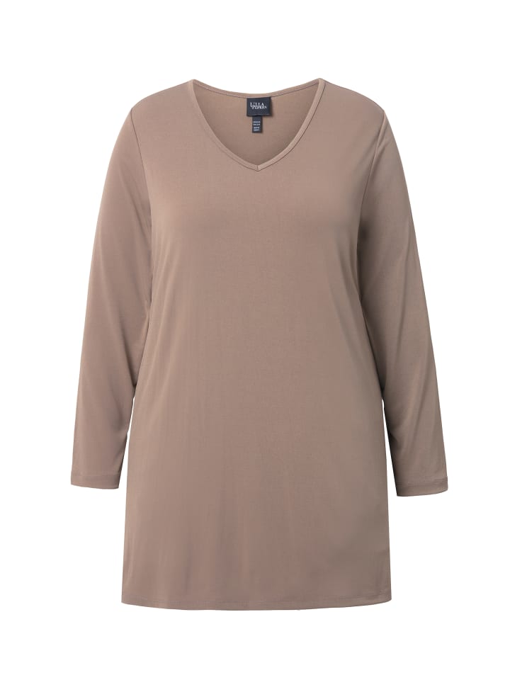 Длинная рубашка, слегка удлиненный А-силуэт, из очень гладкого трикотажа. V-образный вырез, длинные рукава. Боковые разрезы для дополнительного комфорта.