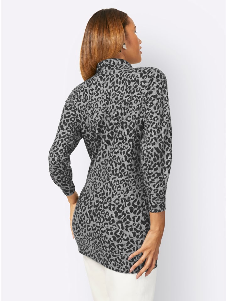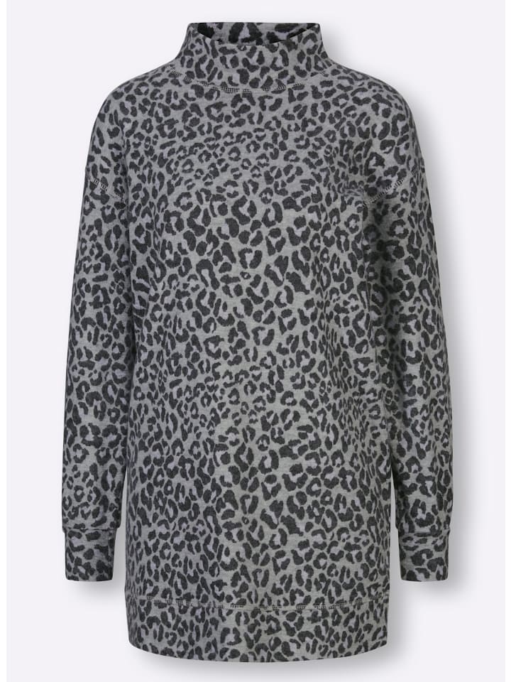 Пушистая длинная рубашка с модным жаккардовым узором по всей поверхности. Отличается воротником-стойкой, который не прилегает к шее, современным спущенным плечом и длинными рукавами.