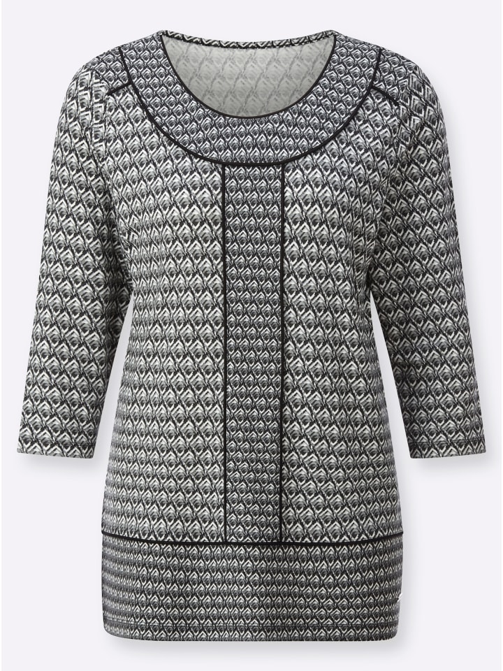 Эта рубашка поистине впечатляет своим универсальным принтом на мягкой, струящейся вискозной ткани! Круглый вырез горловины и рукава три четверти. Среди привлекательных деталей - контрастная окантовка и вставки с мелким набивным рисунком.