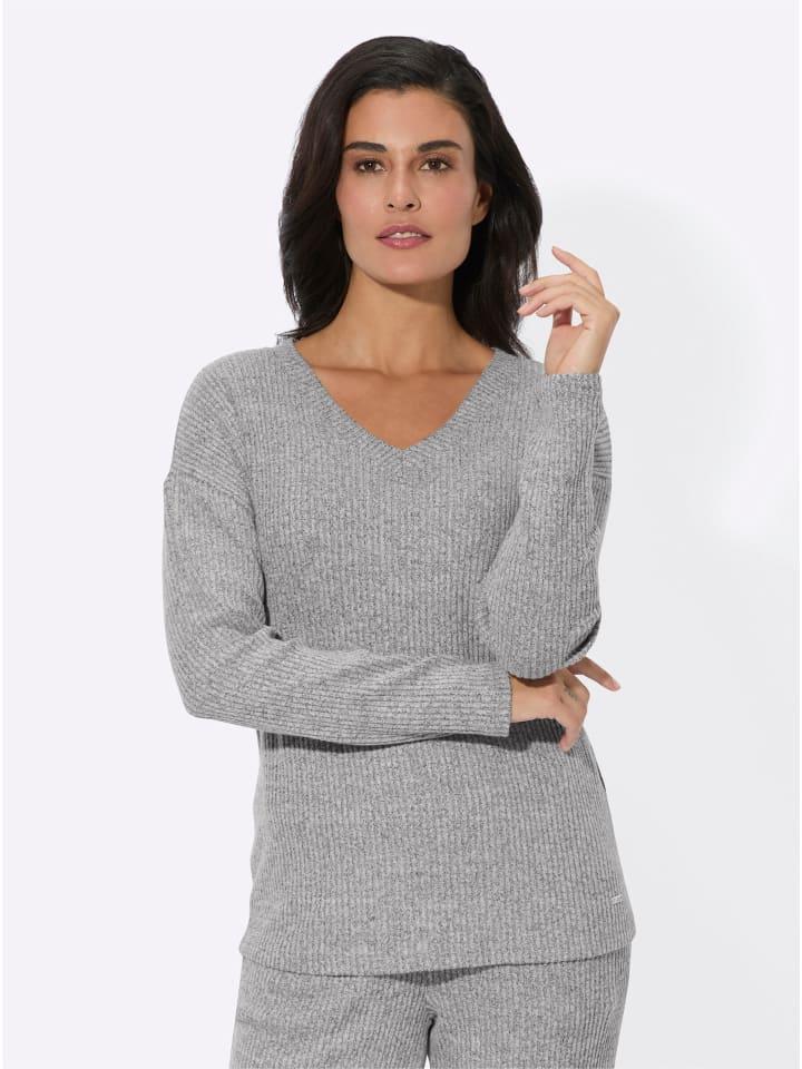Необычайно мягкая рубашка от Feel Good из высококачественного тонкого трикотажа с вискозой. Ребристая текстура по всей поверхности с легким меланжевым эффектом. V-образный вырез. Непринужденно спущенная линия плеч. Серебристый логотип на подоле.