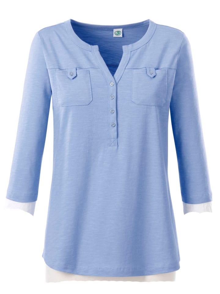 Отличная базовая вещь с изюминкой! Рубашка из модной пряжи с фактурной фактурой. Приятная деталь - два нагрудных кармана с хлястиками и маленькими пуговицами с металлическим эффектом. Круглый вырез горловины с небольшим V-образным вырезом и планкой на пуговицах, рукава 3/4 и закругленный низ.