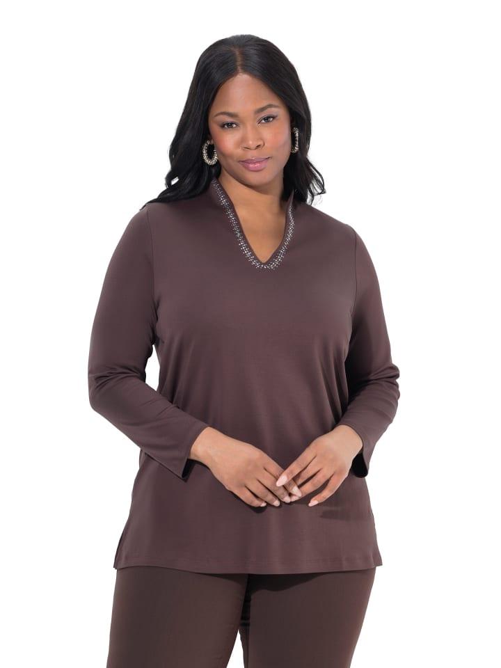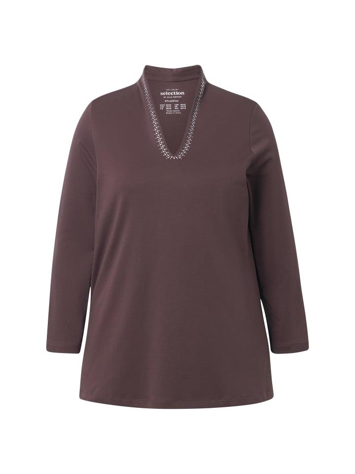 Рубашка А-силуэта с длинными рукавами из очень мягкого хлопкового трикотажа. Особенность: воротник-стойка с элегантной отделкой стразами - при желании можно заменить ожерелье. Длинные рукава, боковые разрезы - для большего комфорта.