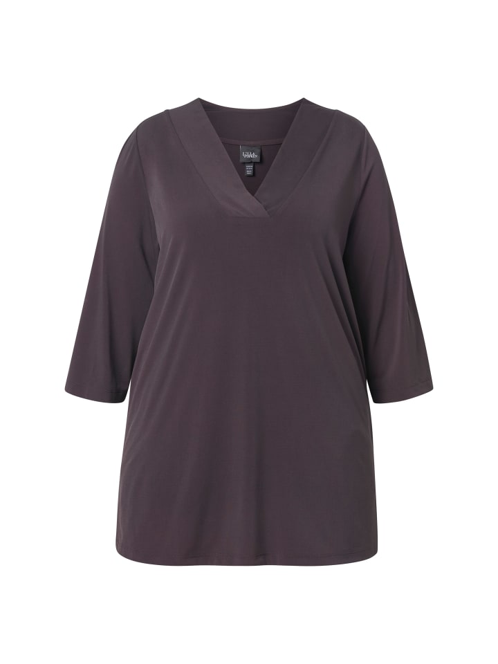Длинная рубашка из исключительно гладкого трикотажа с V-образным вырезом, рукавами 3/4 и разрезами по бокам.
