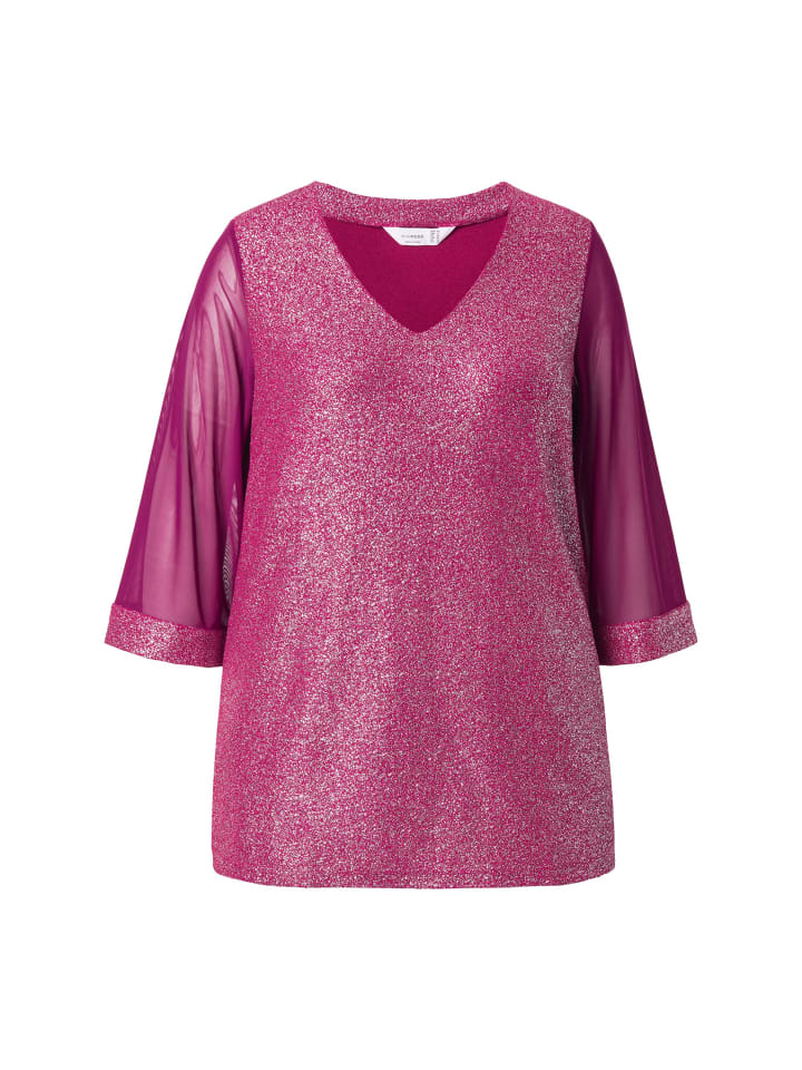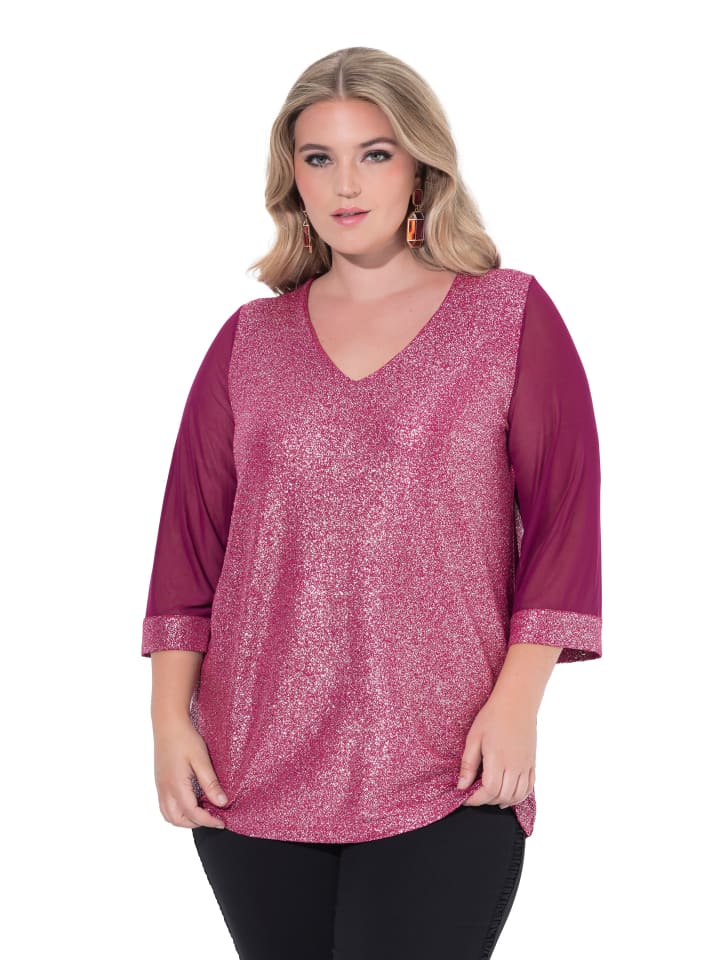 Футболка А-силуэта из мягкого трикотажа с блестками. V-образный вырез, сетчатые рукава-трубы с отделкой блестками.