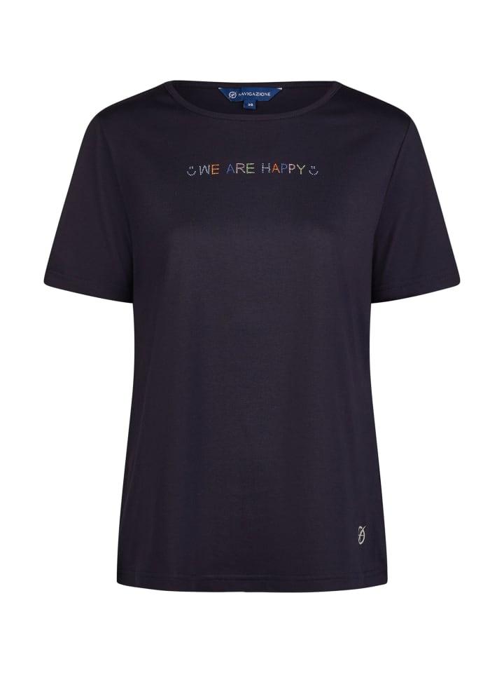 Эта модная женская рубашка сочетает в себе повседневный стиль и блестящие детали. Красочная надпись «WE ARE HAPPY» спереди украшена стразами, что придает рубашке жизнерадостный и стильный вид. Классический круглый вырез горловины и удобные короткие рукава делают ее идеальным вариантом для повседневной носки. Благодаря высококачественному составу (50% хлопка и 50% модала) рубашка приятна на ощупь и обеспечивает исключительный комфорт.