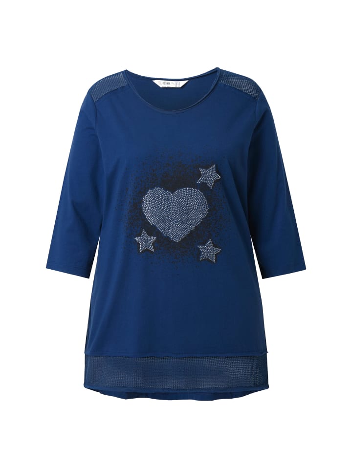 Футболка А-силуэта. Изготовлена из мягкого трикотажа с блестящим сердечком и прозрачными сетчатыми вставками. Изящная кружевная отделка по подолу. Круглый вырез, рукава 3/4.