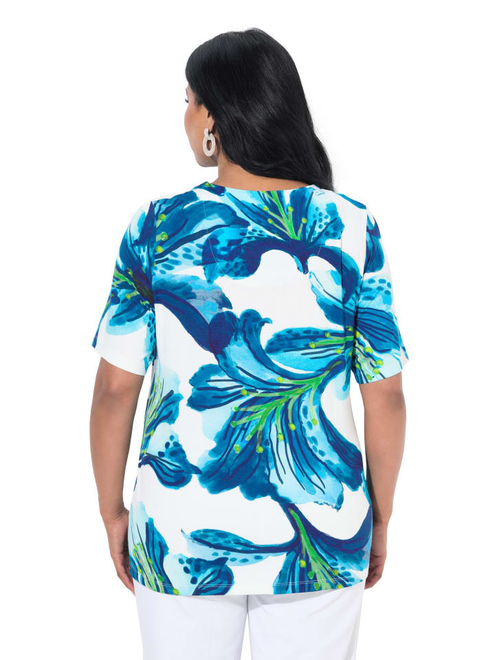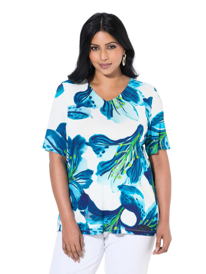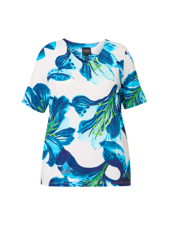 Футболка классического кроя с цветочным рисунком. V-образный вырез, короткие рукава.