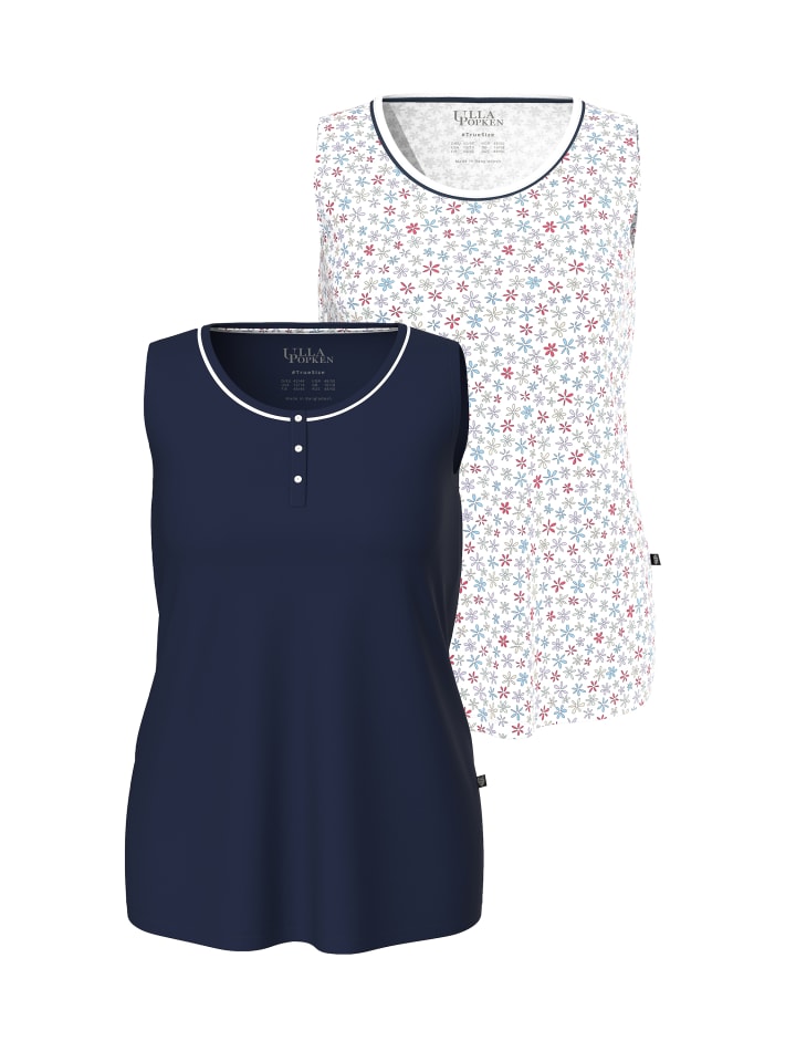 Комплект из 2 пижамных топов прямого кроя. 1 однотонный с круглым вырезом и планкой на пуговицах. 1 с нежным цветочным узором и круглым вырезом. Без рукавов.