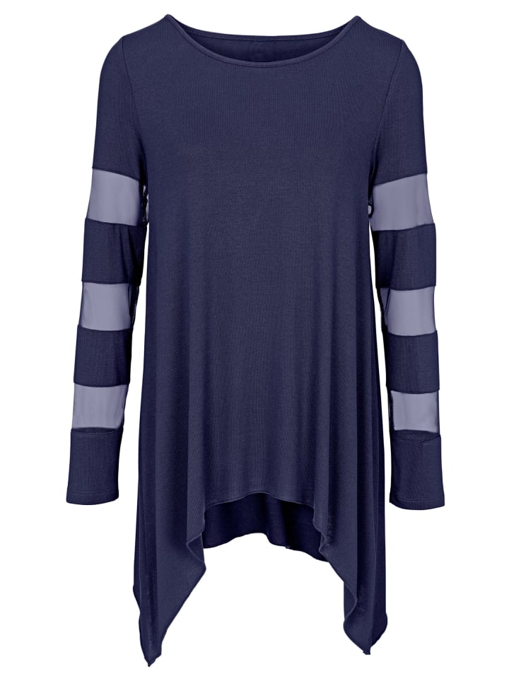 Рубашка: Мягкая, струящаяся ткань, подчеркивающая фигуру. С круглым вырезом и прозрачными вставками на длинных рукавах.