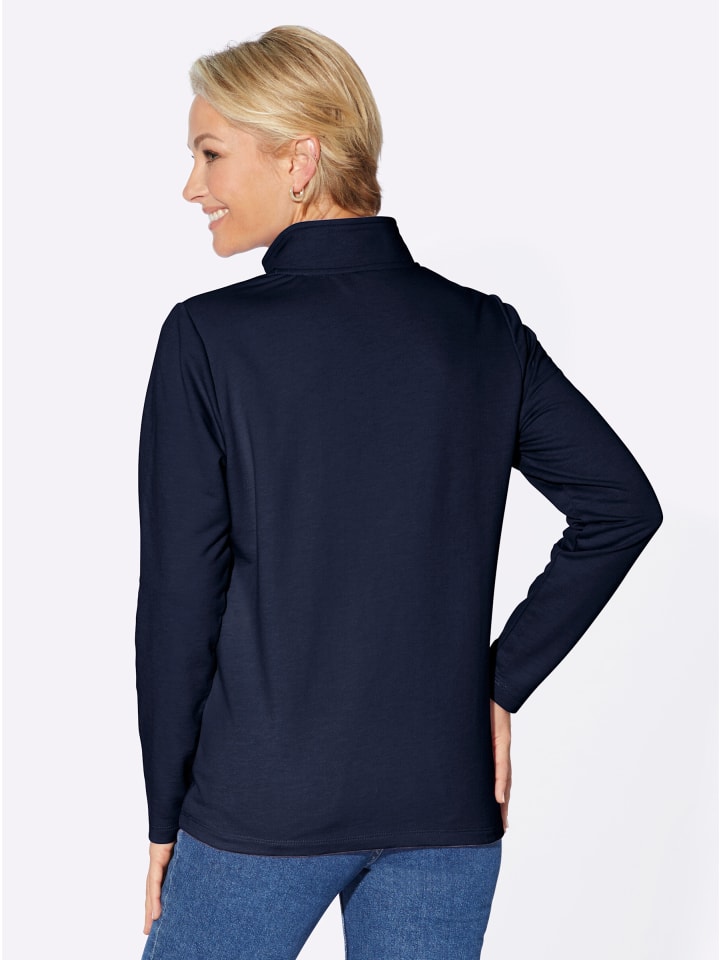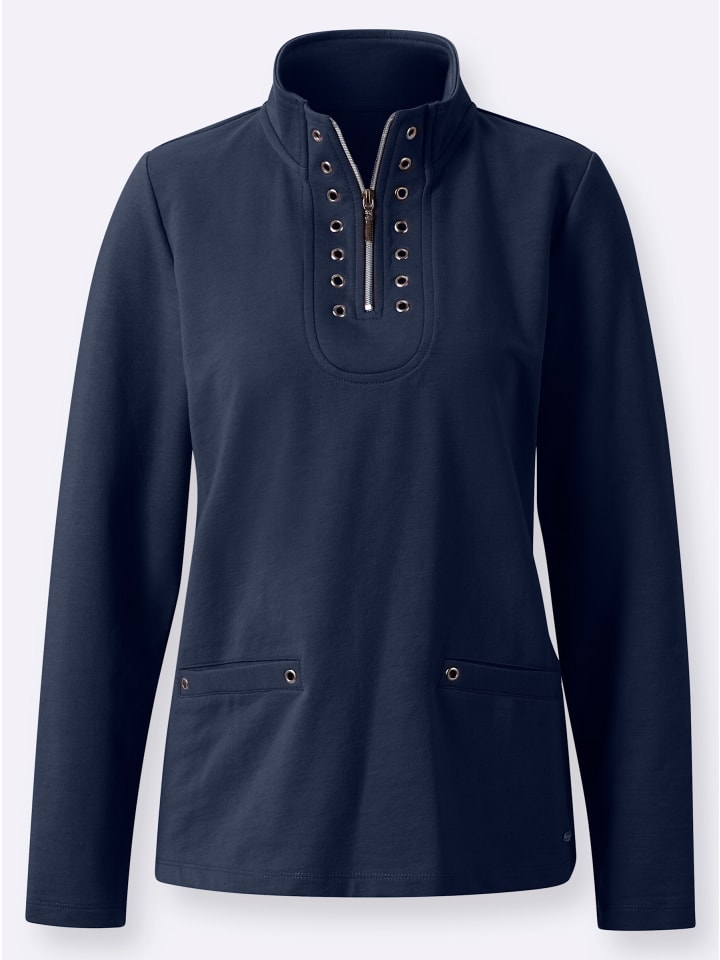 Удобная, эластичная и сохраняет форму: рубашка с воротником-стойкой и декоративной застежкой-молнией с люверсами. Спортивные детали: два декоративных кармана с люверсами. Длинные рукава.