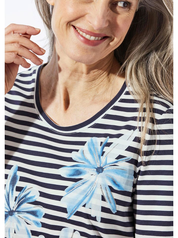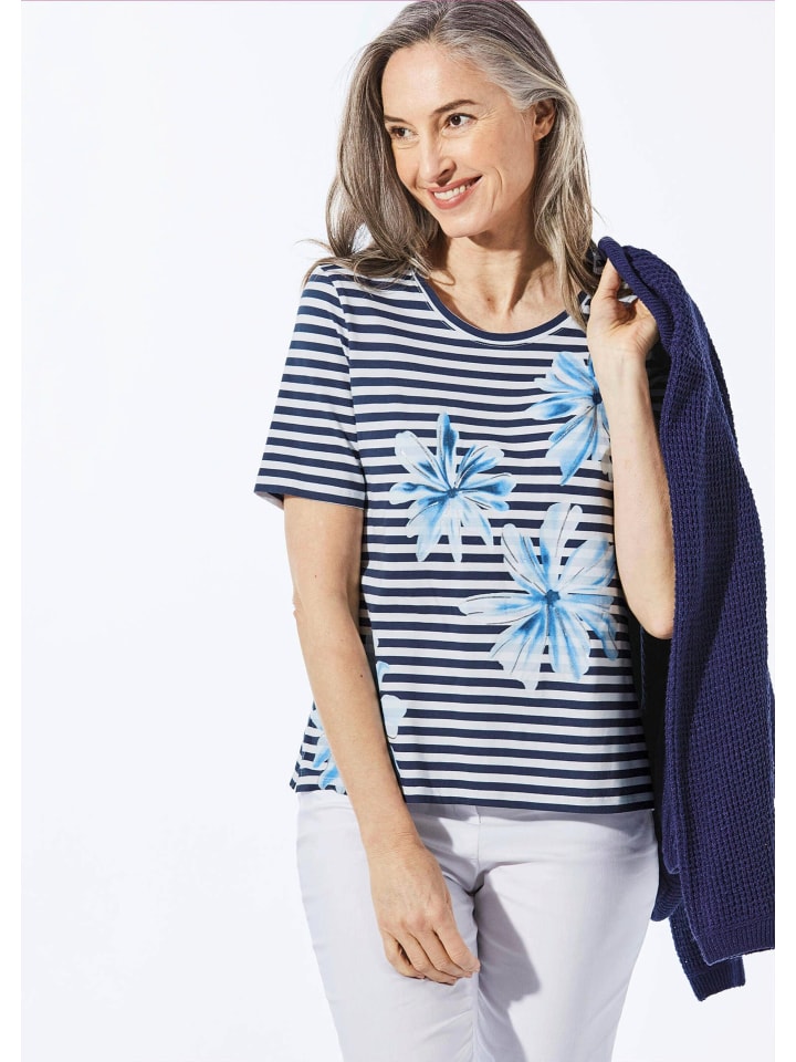 Футболка в удобном морском стиле. Круглый вырез с полосатой отделкой добавляет стильный штрих. Классический крой с прямым нижним краем. Двухцветный полосатый рисунок и цветочный принт спереди делают эту футболку настоящей приманкой для глаз. Очень удобная благодаря эластичной ткани из хлопка и эластана, не требующей особого ухода. Длина: около 66 см для размера 46, около 62 см для размера 23.
