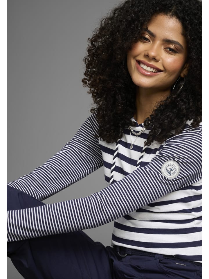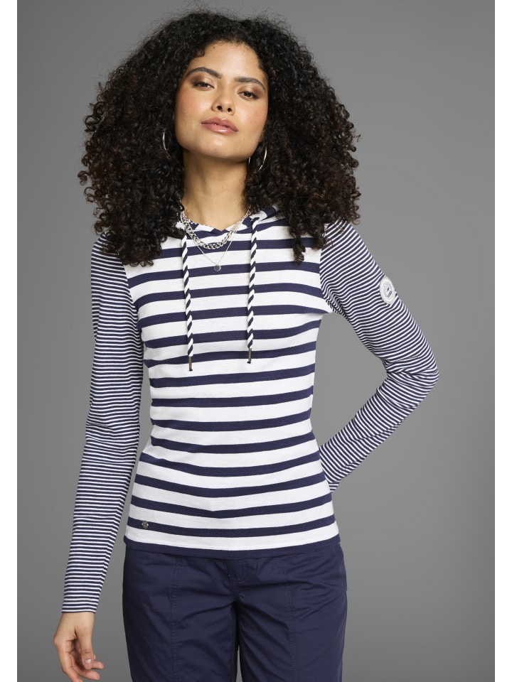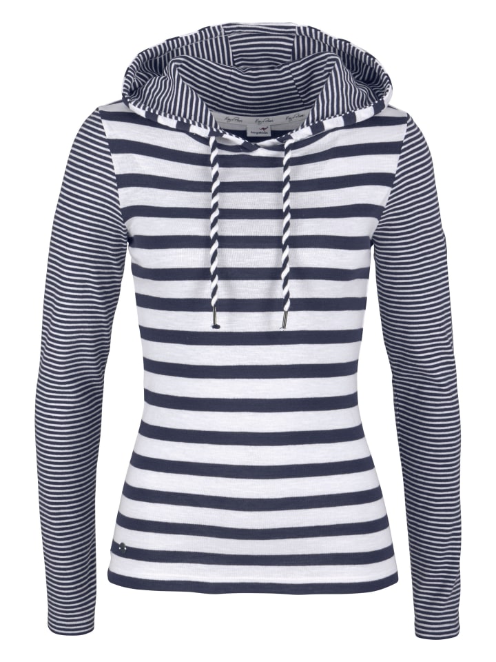 Простая женская рубашка с капюшоном от KangaROOS. Приталенный крой до бедер. Длинные рукава. Благодаря высокой эластичности ребристого материала, верх адаптируется к форме тела.