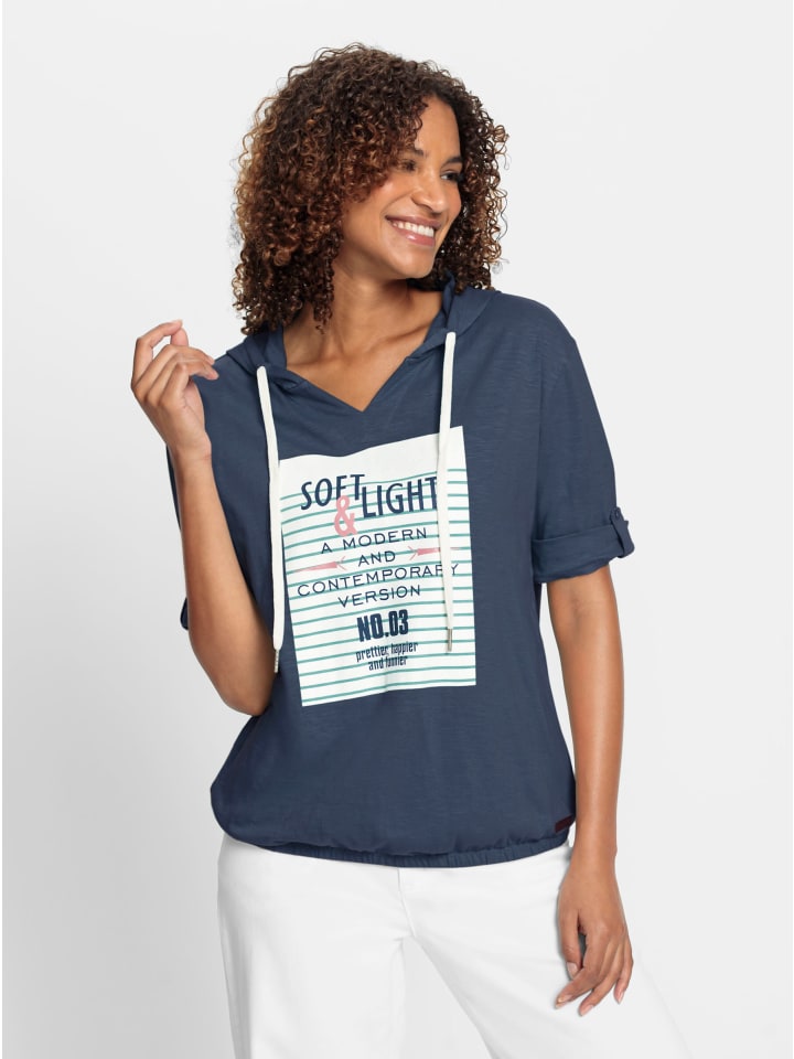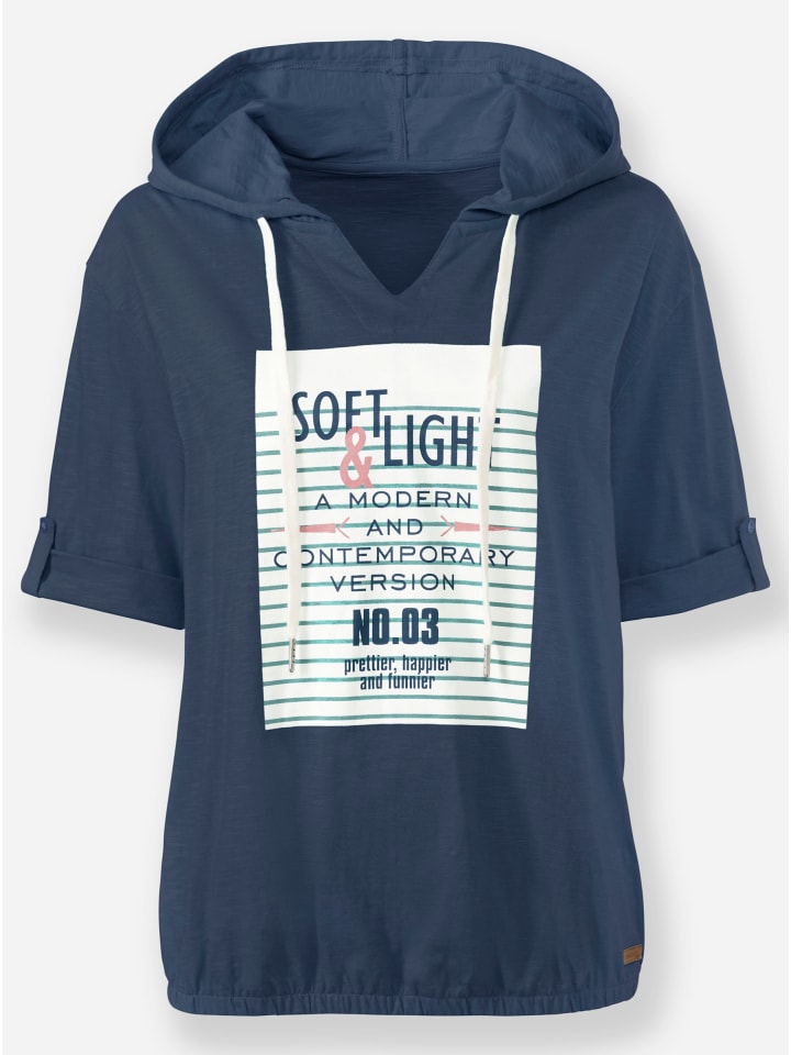 Любимая вещь в спортивном стиле: рубашка с капюшоном из чистого мягкого хлопка с повседневным капюшоном, завязывающимся на шнурок, небольшим V-образным вырезом и стратегически расположенным принтом спереди. Приятная деталь: декоративные хлястики на рукавах средней длины. Благодаря эластичному подолу она красиво драпируется на животе. Сертифицировано GOTS.