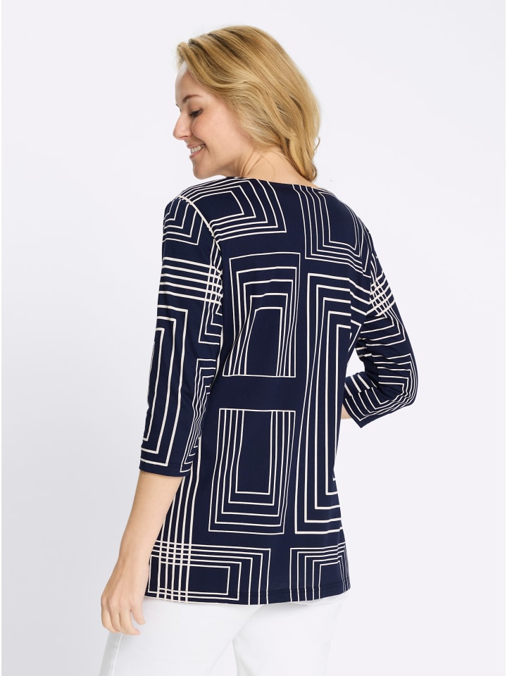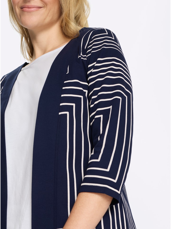 Эта длинная куртка-рубашка привлекает внимание своим графическим дизайном и является фаворитом на каждый день благодаря комфортному однотонному трикотажу и выгодно подчеркивающему фигуру силуэту. Открытый крой с V-образным вырезом и однотонной отделкой по переднему краю визуально удлиняет фигуру. Рукава 3/4.