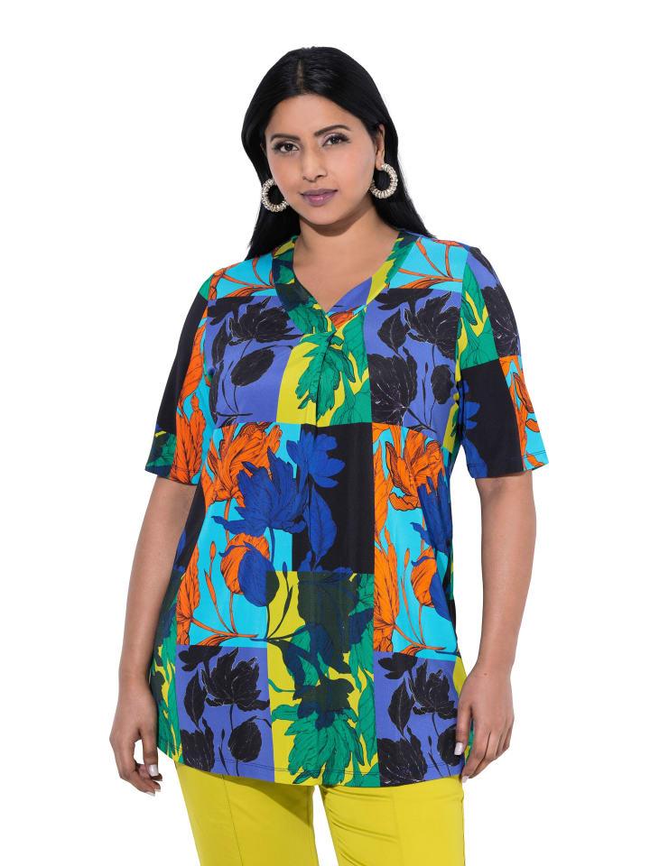 Облегающая рубашка А-силуэта из элегантной облегающей пике с тонкой текстурой и цветным рисунком в виде листьев. Округлый V-образный вырез с высококачественной отделкой, короткие рукава.