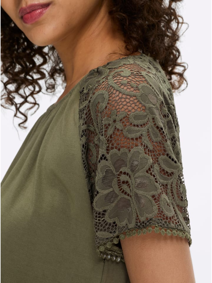 Футболка. Особенно женственная, с короткими рукавами из кружева и сборкой на круглом вырезе. А-силуэт. Изготовлена из вискозы Lenzing ECOVERO.