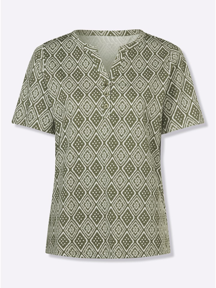 Эта приятная на ощупь рубашка с короткими рукавами выполнена в модном этническом стиле. Круглый вырез горловины, небольшой V-образный вырез и короткая планка с пуговицами.
