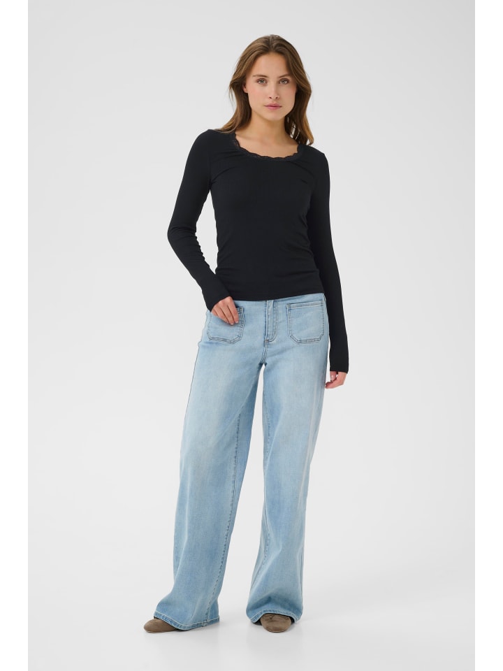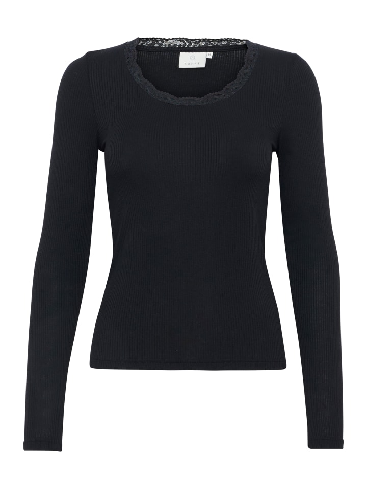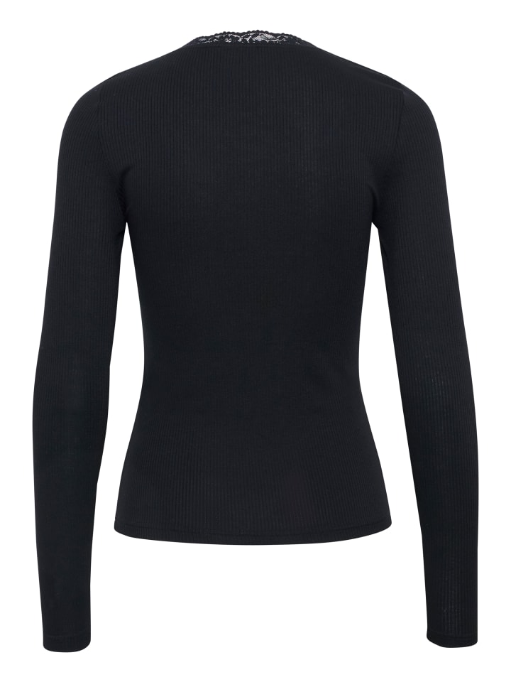 Рубчатая трикотажная рубашка с длинными рукавами, приталенным силуэтом и фестончатым круглым вырезом с изящной кружевной отделкой. Прямой подол и мягкий вид.