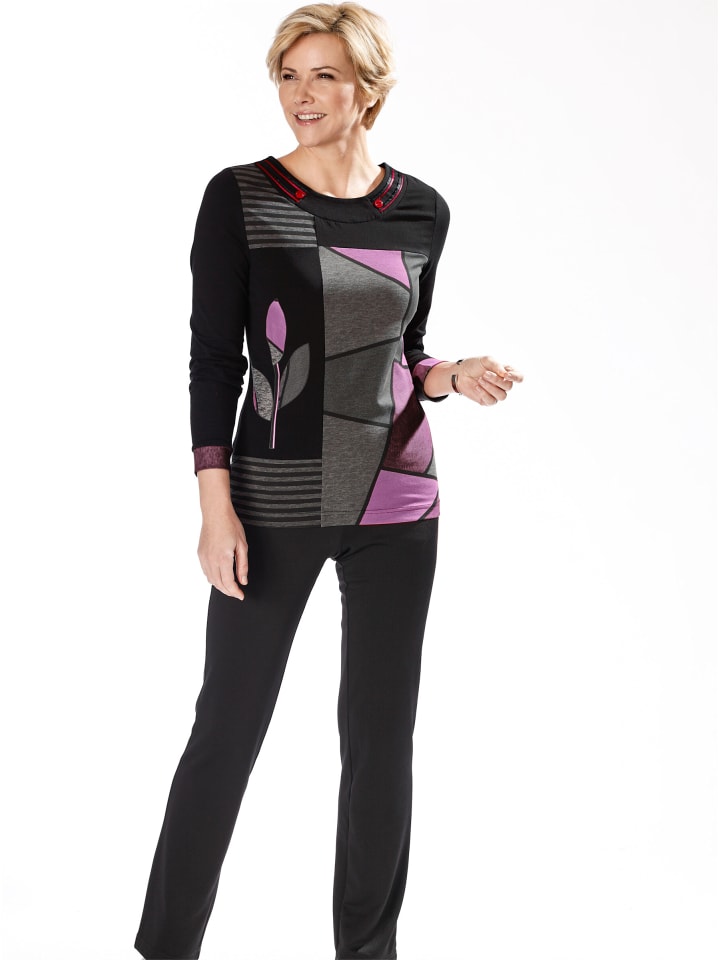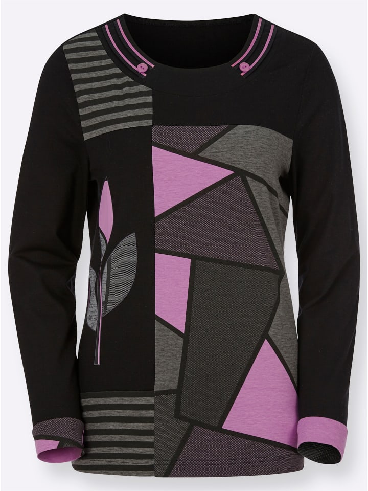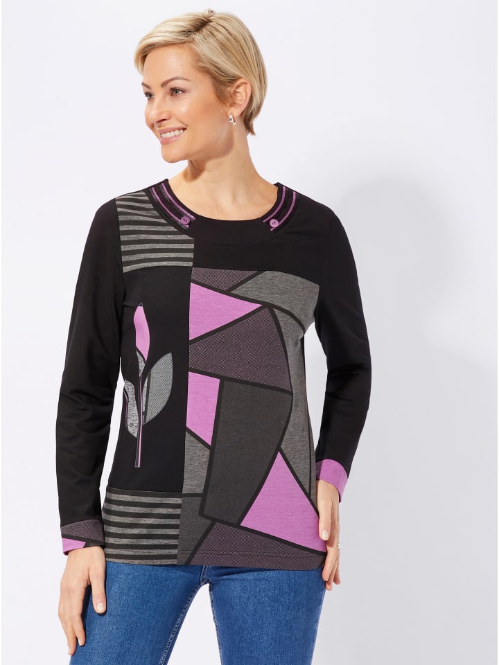 Красивая рубашка с экстравагантным дизайном: пэчворк в контрастных цветах. Посадка может немного отличаться! Широкий круглый вырез горловины украшен декоративными пуговицами и атласной окантовкой.