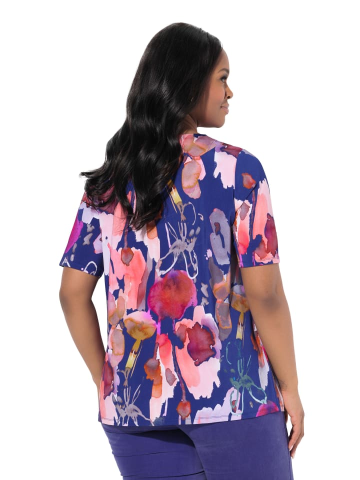 Облегающая рубашка классического кроя из мягкого высококачественного трикотажа с акварельным цветочным рисунком. V-образный вырез с декоративной складкой, короткие рукава.