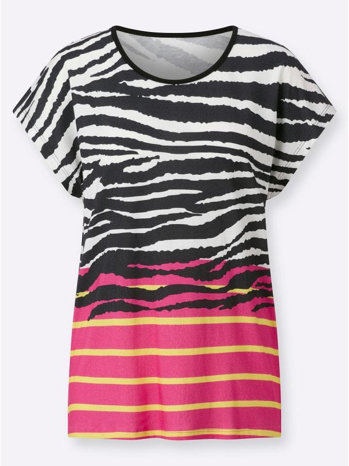 Рубашка с эффектным сочетанием зебрового и полосатого узоров. Однотонный круглый вырез горловины и модные спущенные плечи. Сертифицировано OCS.