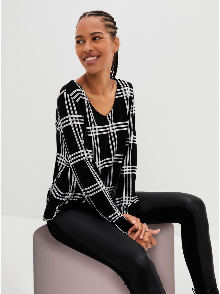 Мягкая, гладкая рубашка с контрастным клетчатым рисунком. V-образный вырез. Свободный крой благодаря эластичным манжетам и подолу.