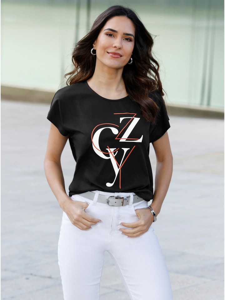 Приятная на ощупь рубашка с короткими рукавами и модным принтом спереди. Современный фасон с круглым вырезом и спущенными плечами.