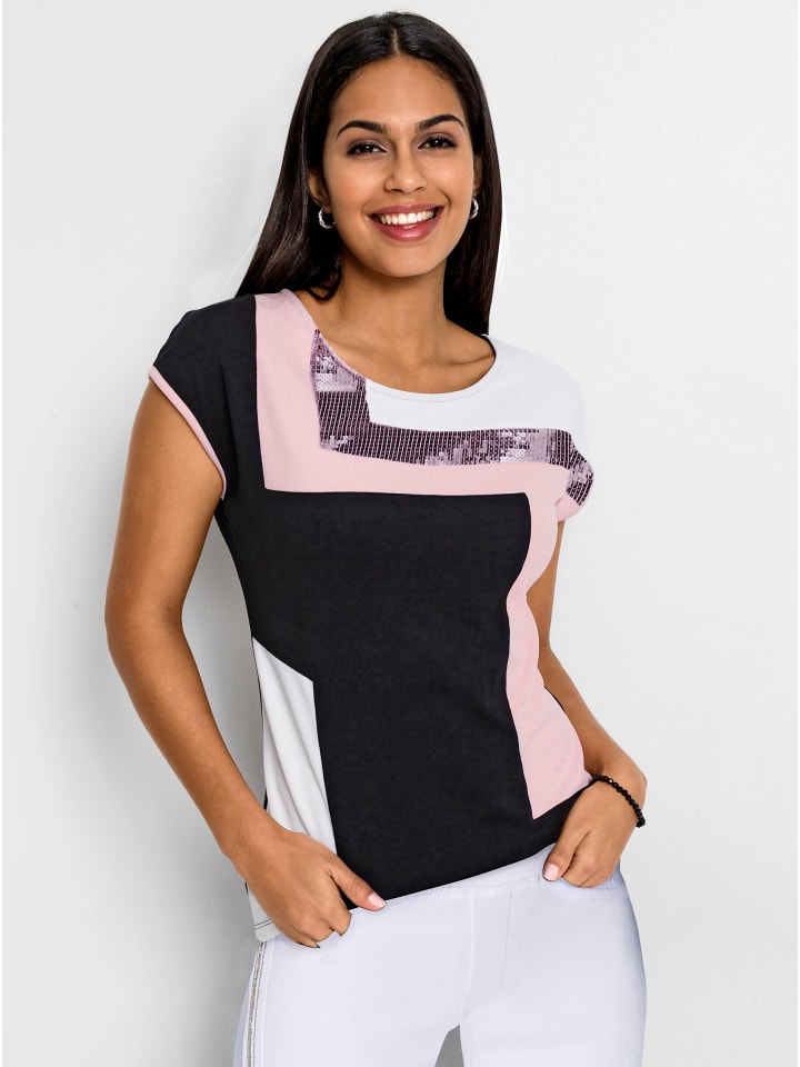 Эта рубашка в стиле пэчворк искусно сочетает в себе эффектный пэчворк-дизайн с элегантно мерцающими пайетками спереди. Она имеет круглый вырез, спущенную линию плеча и контрастную окантовку на манжетах модных коротких рукавов. Изготовлена из приятного трикотажного полотна.