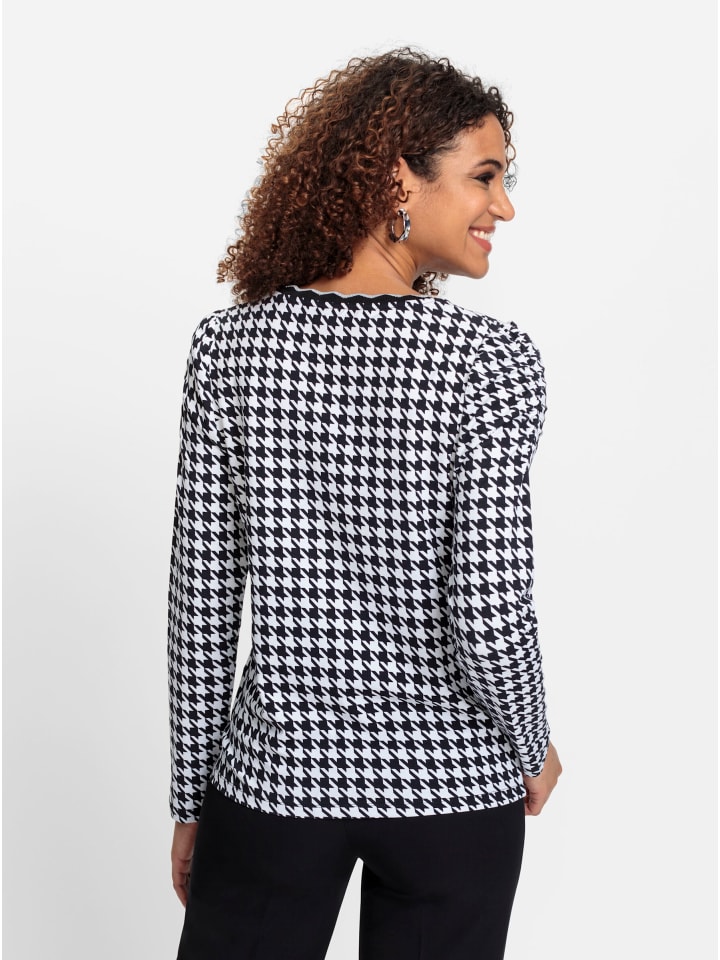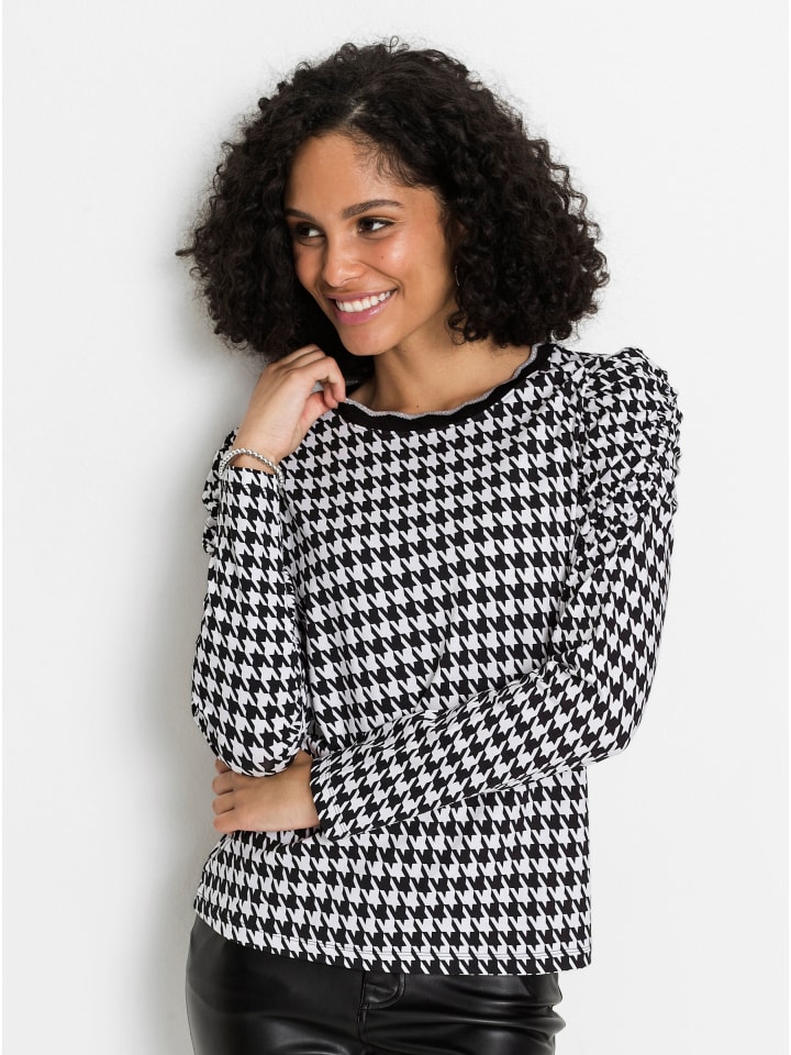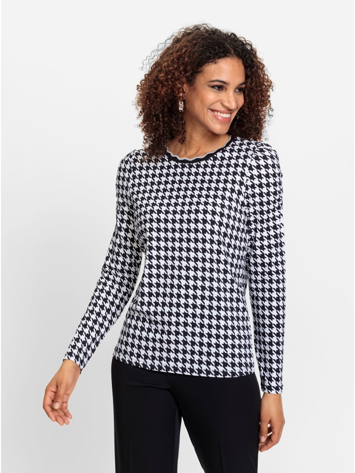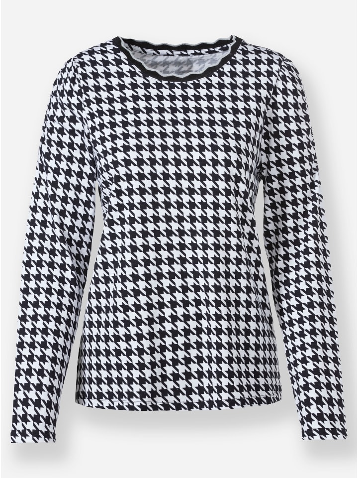 Классический узор «гусиная лапка» в модной интерпретации! Эта рубашка украшена ребристой резинкой с волнистым узором и серебристыми мерцающими акцентами на круглом вырезе. Длинные рукава красиво собраны на предплечьях и плечах. Модель соответствует инициативе «Сделано в Африке» (Cat. Made in Africa).