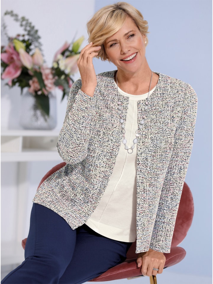 Изящная куртка-рубашка из летней букле с эффектной разноцветной пряжей. Круглый вырез горловины с застежкой на крючок. Вытачки для придания формы груди.