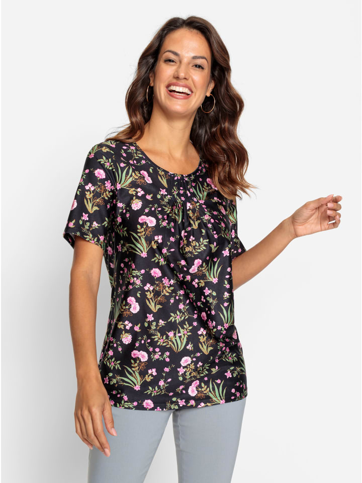 Туника с цветочным принтом из приятной гладкой, слегка глянцевой ткани. Складки на круглом вырезе с окантовкой создают красивую драпировку, подчеркивающую фигуру. Короткие рукава и немного удлиненная длина.