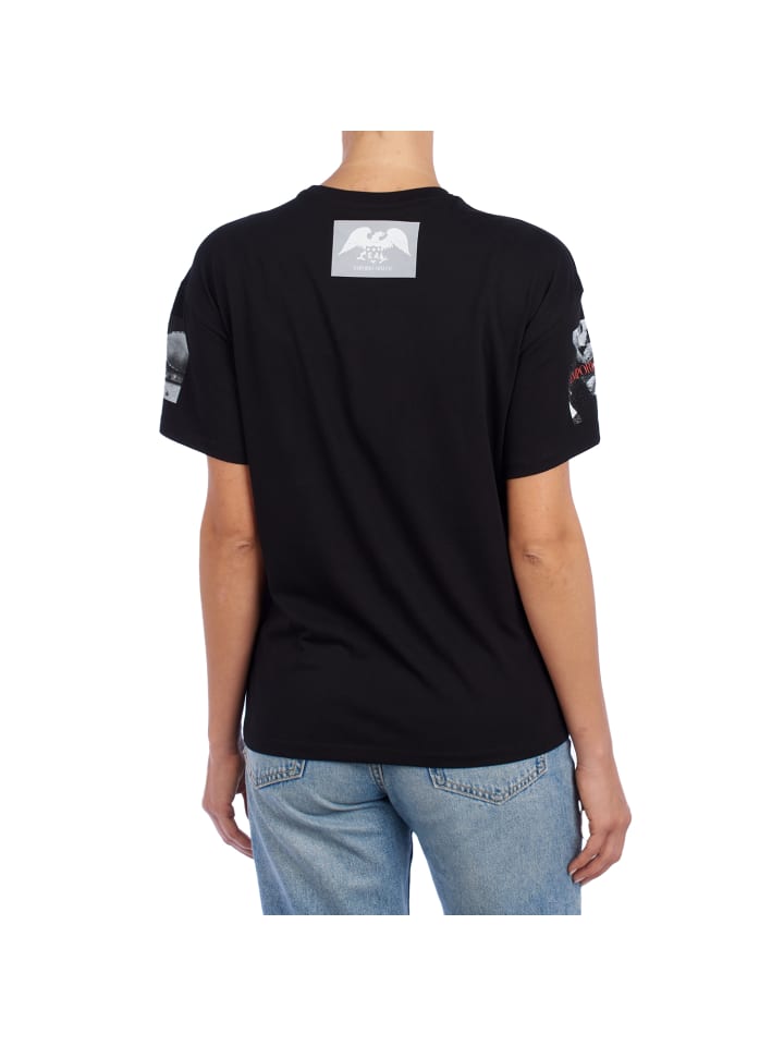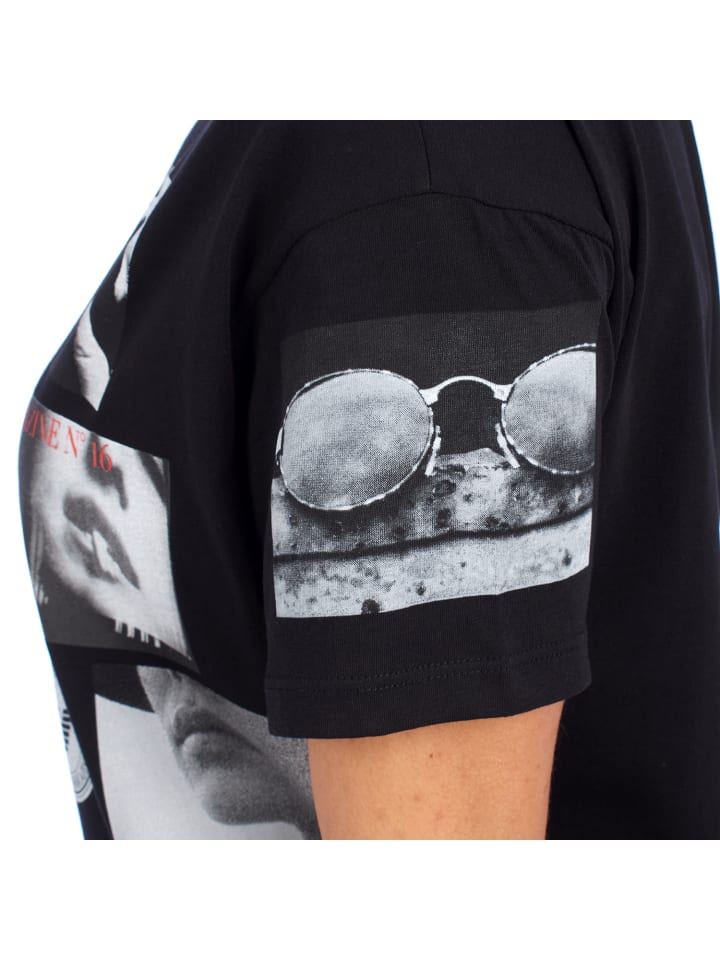 Эта вещь отличается многофункциональным принтом спереди, сочетающим графические элементы и фотографии в монохромных тонах с цветными деталями, что создает современный и художественный визуальный эффект.