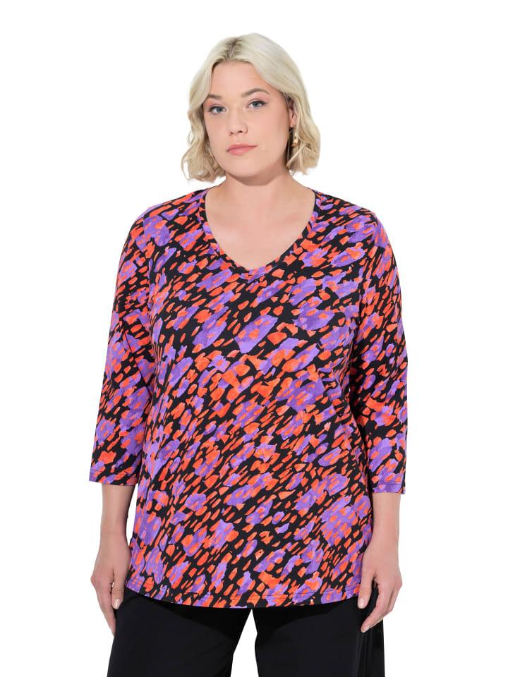 Футболка А-силуэта с рисунком. V-образный вырез, рукава 3/4. Удобный широкий подол.